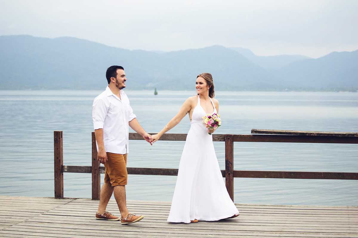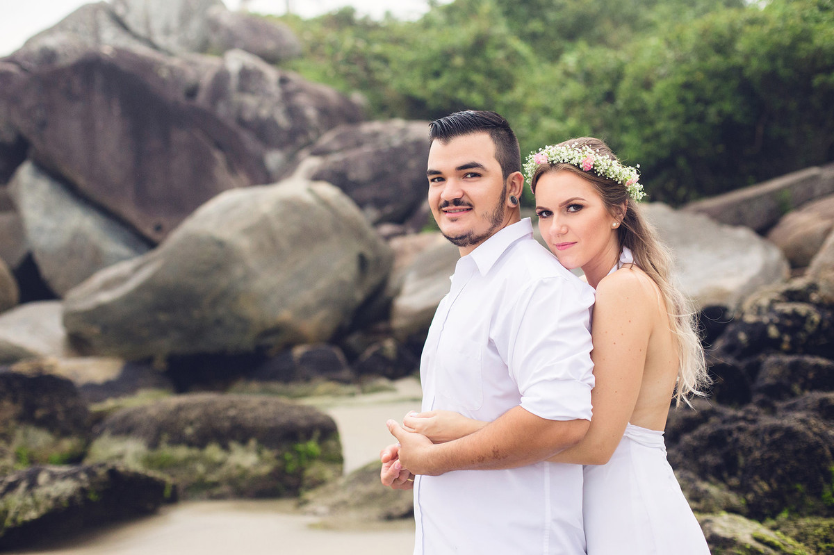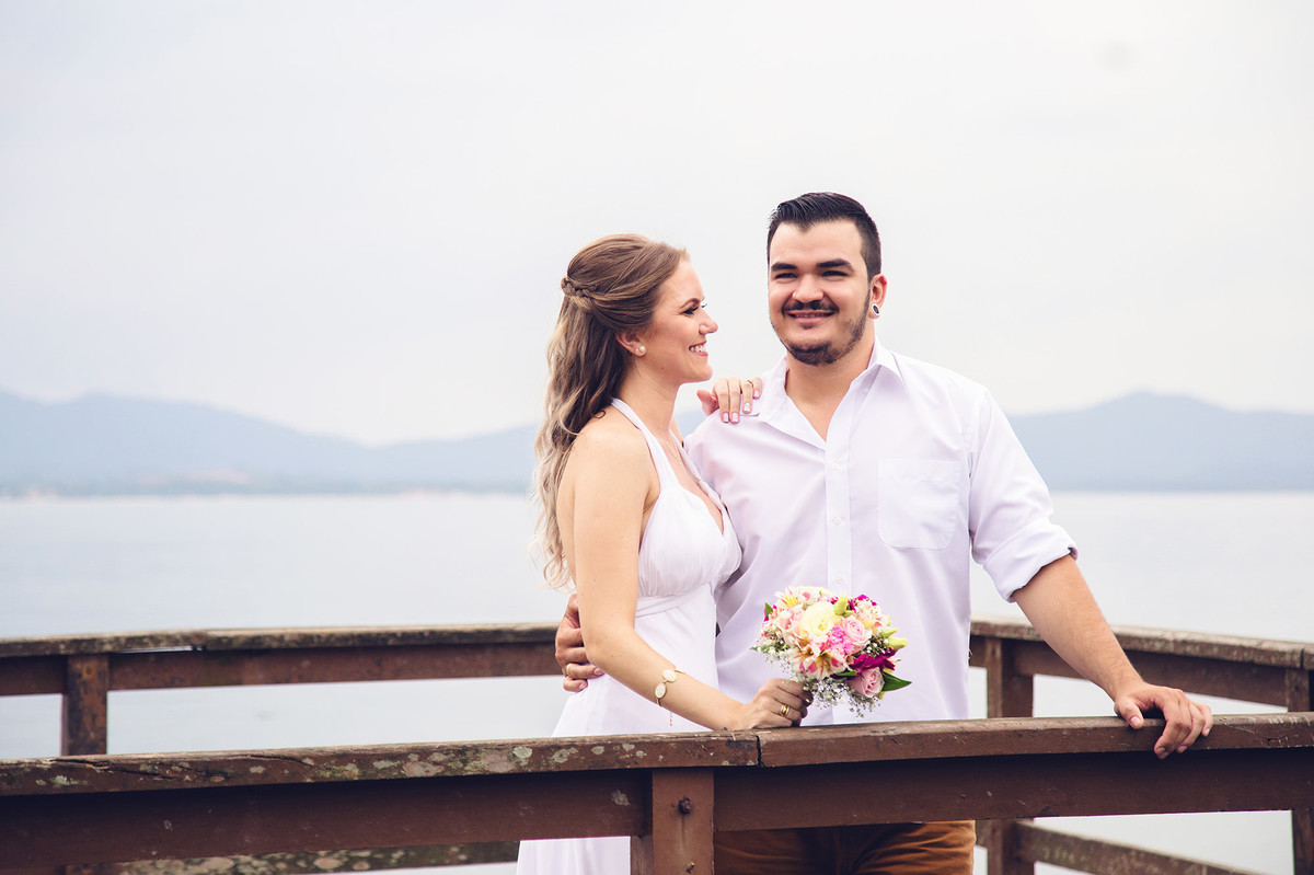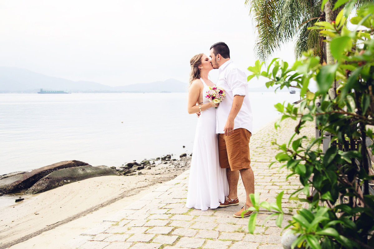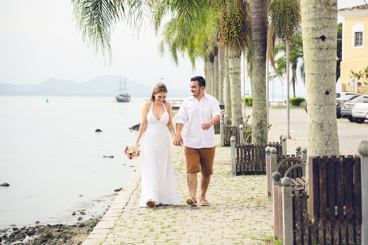 She was an anxious bride, with everything programmed, 2 years before the wedding we signed the contract. Time has passed, we talked about doing the pre wedding session in so many places and we were actually seeing the weather forecast, so the day has come and it was a little bit cloudy and we chose São Francisco do Sul - SC and, with the difficulty to remark the session for a new date, we decided to face the weather.